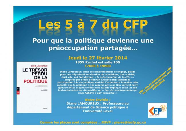 Tweeter Par courrielDate: 27 Février 2014 - 22h00 - 28 Février 2014 - 23h59En savoir davantage: http://www.lecfp.qc.ca/index.php/component/content/article/14-quoi-de-neuf/94-le… Coordonnées: Centre de formation populaire (CFP) 1855, rue Rachel bur. 100 Montréal, Canada