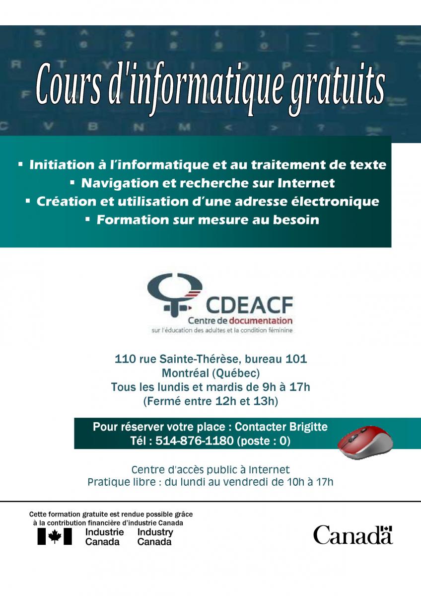Le CDÉACF offre des cours d'informatique gratuits Tweeter Par courrielSource: Centre de documentation sur l'éducation des adultes et la condition féminine (CDÉACF)