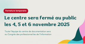 Le centre sera fermé au public les 4, 5 et 6 novembre 2025. Toute l’équipe du centre de documentation sera au Congrès des professionnel·les de l’information. Si vous comptiez vous déplacer, nous vous conseillons de reporter votre visite à la semaine suivante.