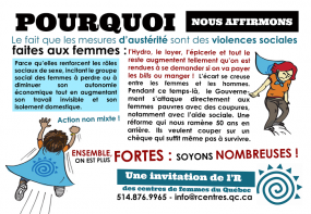 L’R des centres de femmes souhaite mobiliser largement les femmes de divers horizons au Die-In féministe contre l'austérité non-mixte. C’est pourquoi nous invitons toutes les femmes qui fréquentent les centres membres de l’R, mais aussi nos alliées à y prendre part.