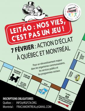Dans le cadre de la campagne "Engagez-vous pour le communautaire", les organismes d'action communautaire autonome se donnent rendez-vous le 7 février pour une action nationale d'éclat consistant à occuper simultanément deux édifices gouvernementaux, un à Québec et un à Montréal, sous le thème : Leitao : nos vie, c'est pas un jeu!