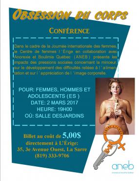 Dans le cadre de la Journée internationale des femmes, le Centre de femmes l'Érige en collaboration avec Anorexie et Boulimie Québec (ANEB) présente les impacts des pressions sociales concernant la minceur, sur le développement des difficultés reliées à l'alimentation et sur l'appréciation de l'image corporelle.