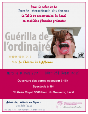 Dans le cadre de la journée internationale des femmes, la TCLCF invite ses membres et les Lavalloises à un souper-spectacle avec du mordant. Le spectacle Guérilla de l’ordinaire, mettant en vedette Le Théâtre de l’Affamée présente des textes autour des manifestations visibles et invisibles du sexisme ordinaire, tant dans les espaces publics que privés.