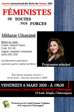 Le Comité Femmes Vigilantes de la région de Châteauguay invite donc les femmes et les filles de 14 ans et plus à souligner la Journée internationale des femmes au Centre culturel Vanier à Châteauguay le vendredi 6 mars à 19 h 30. Les billets sont en vente au coût de 15,00 $ (argent comptant seulement) au Centre culturel Vanier, 15, rue Maple à Châteauguay. Les places sont limitées et ne peuvent être réservées. Les portes ouvriront à 19 h.