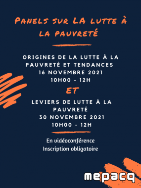 Pour en discuter, les 16 et 30 novembre prochain, de 10h00 à midi, le MÉPACQ tient deux panels sur la question de la lutte à la pauvreté. Le 30 novembre on se penche sur les leviers de lutte à la pauvreté. 3 intervenant.e.s nous présenteront chacun.e une campagne que mène leur organisation pour lutter contre la pauvreté. Ils et elles nous partageront les choix stratégiques qui soutiennent leur campagne; pourquoi avoir privilégié cet angle? Quel en est la portée? Quelles en sont les limites?