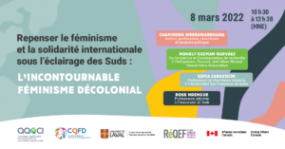 À l’occasion de la Journée internationale des droits des femmes, la Chaire Claire-Bonenfant- Femmes, savoirs et sociétés de l’Université Laval et le Comité québécois femmes et développement (CQFD) de l’AQOCI organisent une rencontre virtuelle sur le féminisme décolonial, le 8 mars prochain de 10h30 à 12h30 (heures de Montréal).
